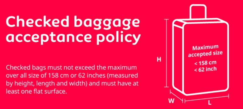 Each checked bag must not exceed 32 kg and 158 cm (62 inches) in total dimensions (length + width + height).